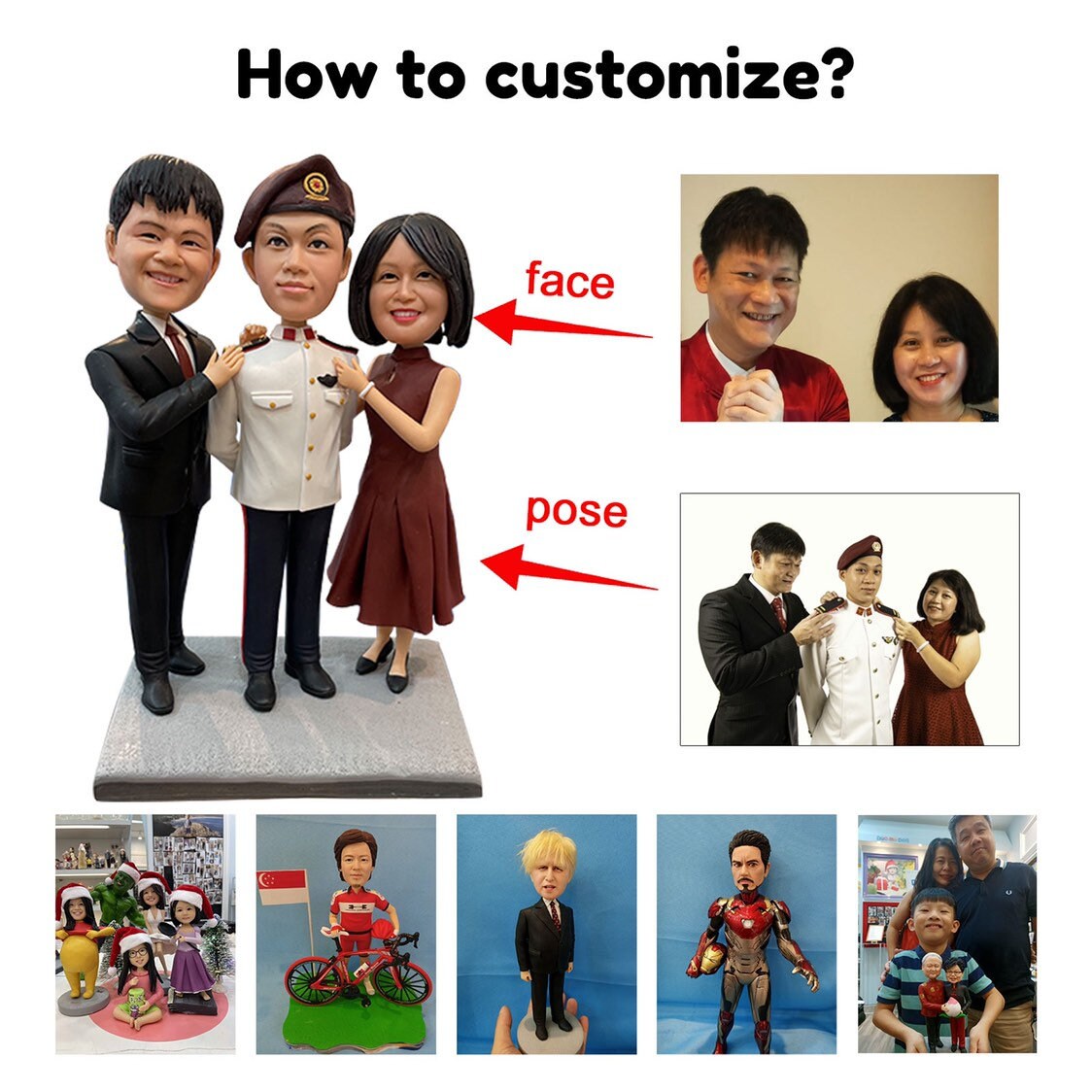 2. provide front view face photo, and photo of the outfit and pose, and any other photos that would help us in understanding your customisation details!